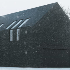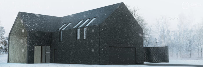 Projekt domu jednorodzinnego w okolicach Lublina. Elewacje oraz ogrodzenie wykonane z czarnej cegły.