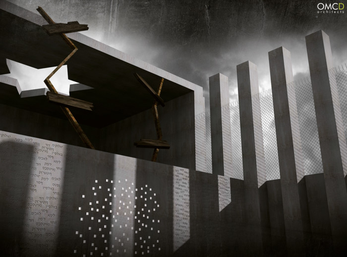 Przy ulicy Zimnej na wysokości opracowywanej działki, płytki chodnikowe zastąpione zostają kostką brukową, która jest nawiązaniem do oryginalnej nawierzchni terenu. W tym też miejscu, zostały ułożone tory kolejowe, które prowadzą w głąb placu – wykopu (nawiązanie do dawnej rampy kolejowej). Z prawej strony umiejscowiono dziesiątki kubików różnej wysokości, które przechodzą w rząd wysokich, betonowych słupów. W ten symboliczny sposób przedstawiono oprawców ludności żydowskiej, nieugiętych oraz obojętnych na ludzkie cierpienia. Każdy ze słupów jest podświetlony nocą lampami. Na końcu wykopu, znajduje się wielka, betonowa ściana. W miejscu, gdzie tory wbijają się w mur, zaprojektowano setki otworów, w których umiejscowiono diody barwy białej. Jest to symboliczne przedstawienie setek dusz, dla których w tym miejscu zaczęła się ostatnia podróż. Na pozostałej części betonowej ściany wyryto imiona ludności żydowskiej. Wyżej znajduje się zadaszony plac. Początkiem tej części projektu są dwie, powykrzywiane szyny kolejowe. Dalsza część tego miejsca została wyłożona zniszczonymi resztkami torów kolejowych oraz betonowych słupów. W ten sposób podkreślono definitywny koniec oraz zrujnowanie życia ludzkiego.